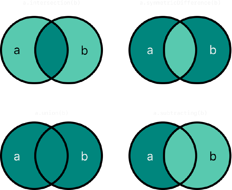 intersection(交集):兩者都有的。(左上)symmetricDifference(對稱差集):兩者其中之一有的,但不是兩者都有的 (A ∪ B - A ∩ B)。(右上)union(聯集):兩者所有的。(左下)subtracting(差集):A 有但 B 沒有的。(右下)